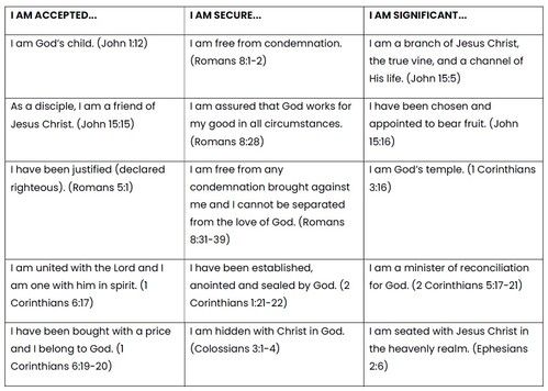 A selection of these ‘In Christ’ identity statements have been listed below under the three categories: I am Accepted; I am Secure; and I am Significant.
