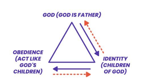 Clockwise is the correct way round this triangle. God is at the top and is the source of everything. He gives us our identity in Christ – e.g. righteous, holy, forgiven, chosen, alive, etc., simply because we are now united with Jesus . We then obey God because it is now part of who we are.