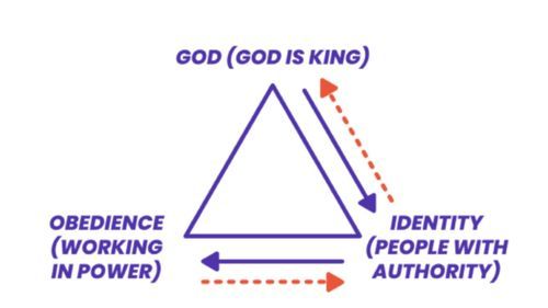 Kingdom is to do with the responsibility that God gives His people. The right way round the triangle is to note that God is the King and he gives his people authority to enable them to carry out the things that he wants them to accomplish. The wrong way round the triangle is to try and do lots of things in our own strength to try and somehow obtain our authority or profile to do the work of God.