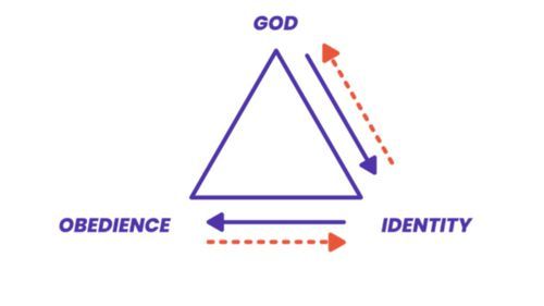 Anti-clockwise is the wrong way round the triangle. We need to be careful that we don’t seek to try and be obedient in order to become something (i.e. establish our own identity) in order to somehow get to God. This would be to ignore all that God has done for us through Jesus and would lead to us living a life of striving and working for something we actually already have in Christ.