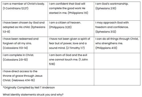 A selection of these ‘In Christ’ identity statements have been listed below under the three categories: I am Accepted; I am Secure; and I am Significant.